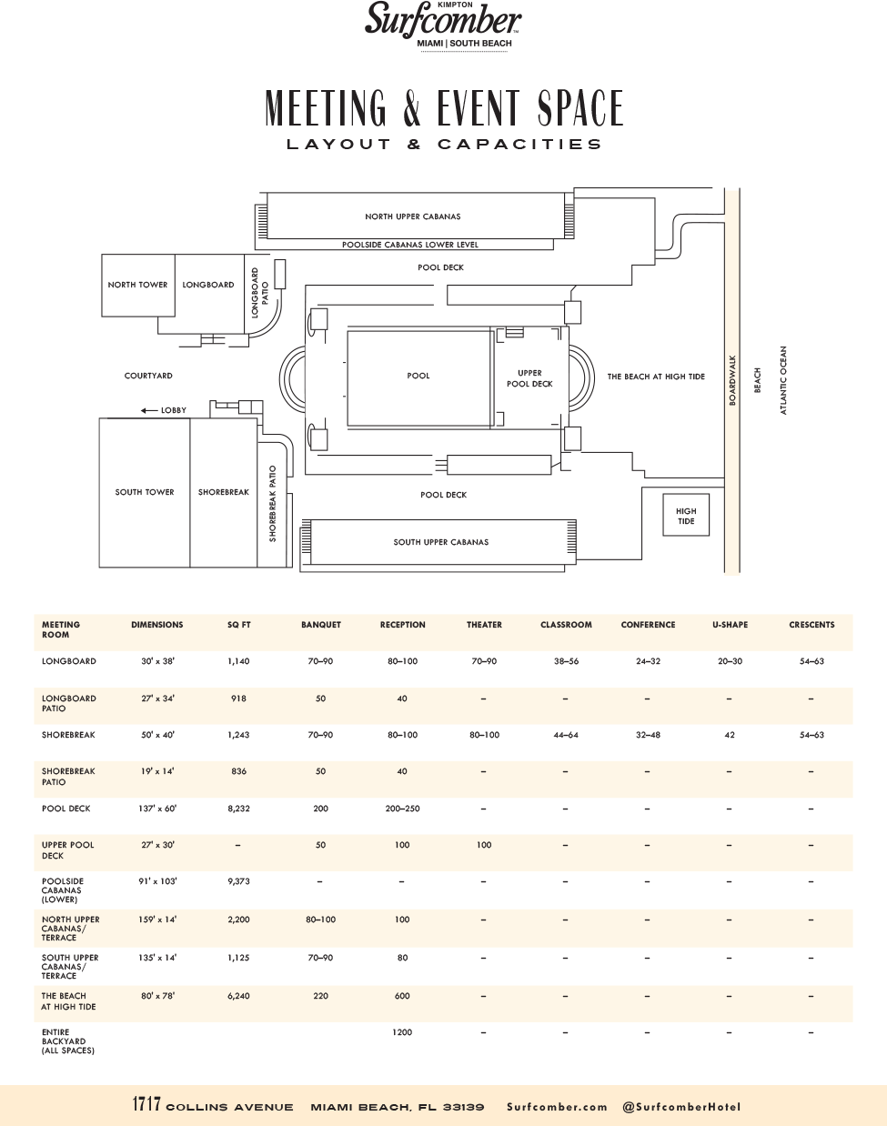| Shorebreak Patio | 19' x 14' | 836' | 50 | 40 | - | - | - | - | - | Yes | |